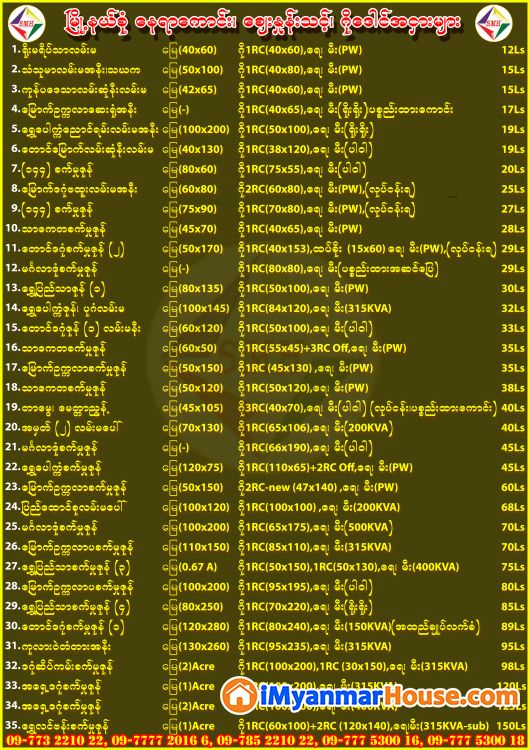 အောက်ဖော်ပြပါ Linkတွင်လည်း အခြားသော မြေကွက်၊ စက်မှုဇုန် စက်ရုံ/ဂိုဒေါင်၊ လုံးချင်းအိမ်၊ ကွန်ဒို/တိုက်ခန်း များကိုလည်း ဝင်ရောက်ကြည့်ရူ့နိုင်ပါသည်။