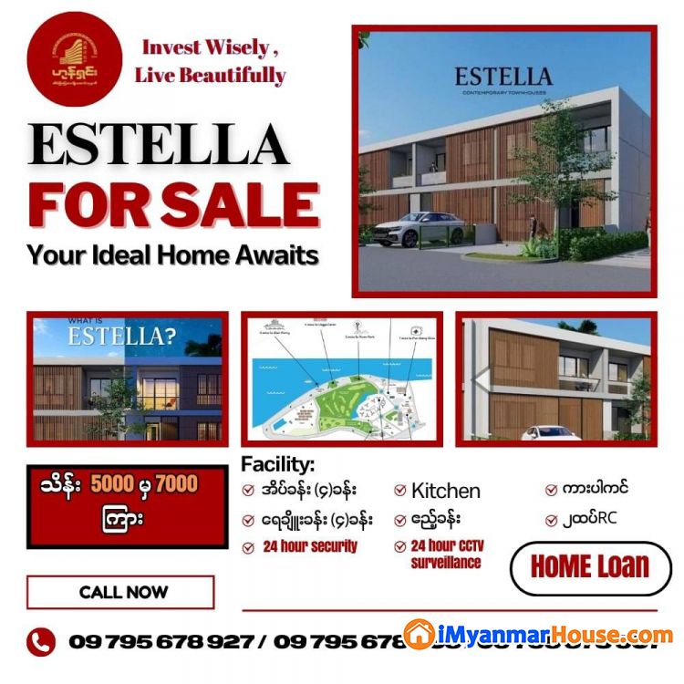 ယခု Estella Townhouseကြော်ငြာများအပြင် ရန်ကုန်မြို့နယ်စုံရှိ အိမ်၊ခြံ၊မြေ၊Condo၊Aparment အရောင်းများလည်းရှိတဲ့အတွက်ကြောင့် စိတ်၀င်စား၍ အသေးစိတ်သိရှိလိုပါက အောက်ပါဖုန်းနံပတ်များကို ဆက်သွယ်နိုင်ပါတယ်ခင်ဗျာ.......