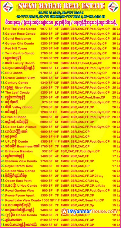 #KanbaeTower #StarVilla #GoldenRose Condo #Paragonresidence #RiverViewPoint Condo #JunctionMawtin #InyaRoad #GoneyiResidence ð¯