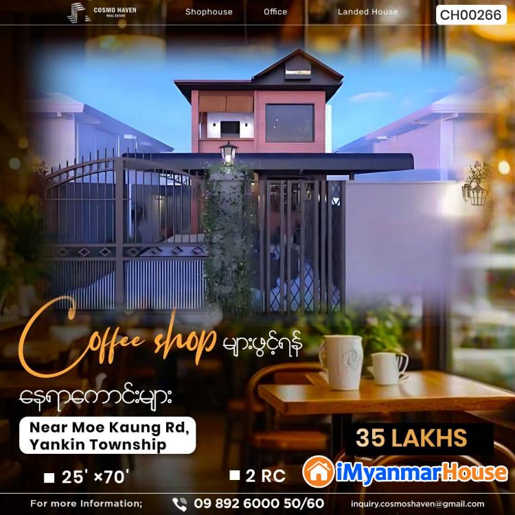 ညွှန်းရလွယ်ကူသော နေရာကောင်းများတွင် ☕Coffee Shop ၊ 🍰 Cake and Bakery Shop များကို Luxury ဆန်ဆန်ဖြင့်ဖွင့်လှစ်နိုင်စေရန် လုပ်ငန်းလိုအပ်ချက်အရ ပြင်ဆင်ဖွဲ့စည်းနိုင်သော Commercial နေရာကောင်းများကို 🕚အချိန်ကုန်သက်သာစွာ ရွေးချယ်နိုင်စေရန် Cosmo Haven Real Estate မှာ လူကြီးမင်းတို့ကို တစ်စုတစ်စည်းတည်း ရွေးချယ်ဖော်ပြပေးလိုက်ပါတယ်ရှင့်💁💁🆙️🆙️🆙️