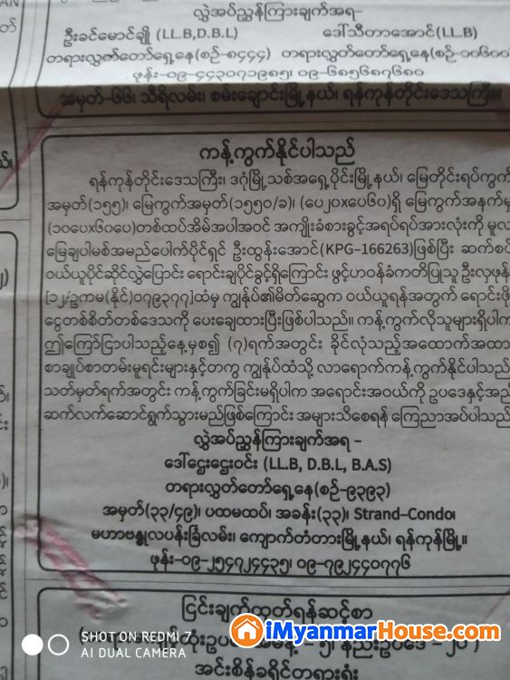 လက်ရှိ ကျွန်တော်တို့မှာ မြို့နယ်စုံ မြေကွက်၊ ဂိုဒေါင်၊ စက်ရုံ၊ ဆိုင်ခန်း၊ လုံးချင်းအိမ်၊ တိုက်ခန်း၊ ကွန်ဒို စသဖြင့် အရောင်းအငှား စာရင်း ၂၀၀၀ ကျော် အချက်အလက် စာရင်းရှိတာဖြစ်တဲ့အတွက် အကိုတို့ အမတို့ လိုအပ်သည့် မြို့နယ်၊ လိုချင်သည့်အကျယ်အဝန်း၊ ငွေပမာဏတို့အား အသေးစိတ်ကို ဖုန်းဆက်ပြီး မေးလို့ရပါတယ်ခင်ဗျာ၊