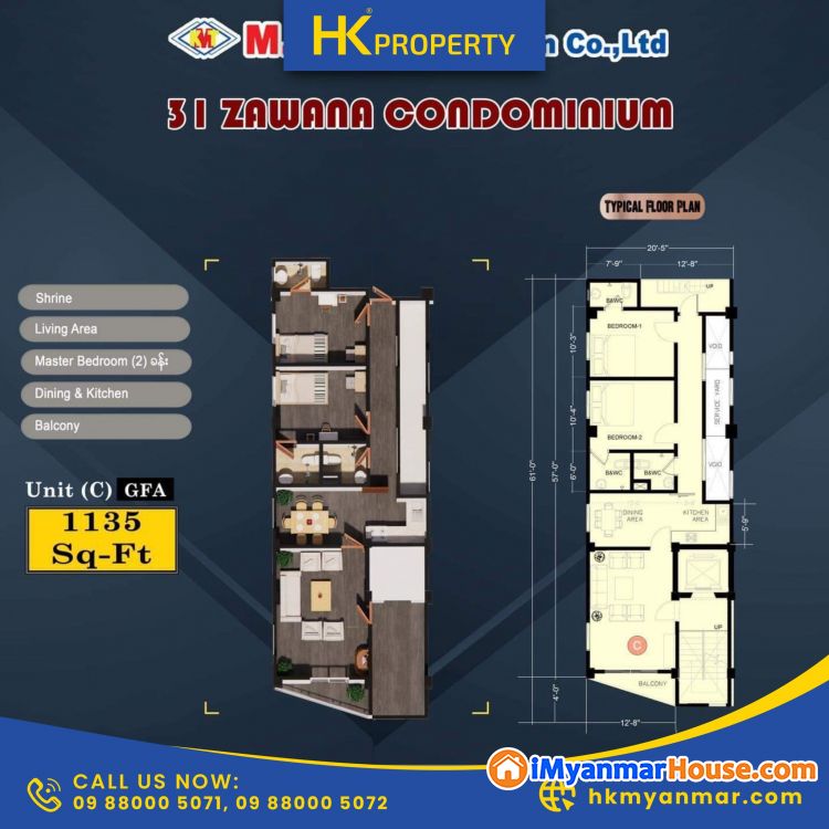 ◾အခန်းအကျယ် - (Sqft- 1135)
