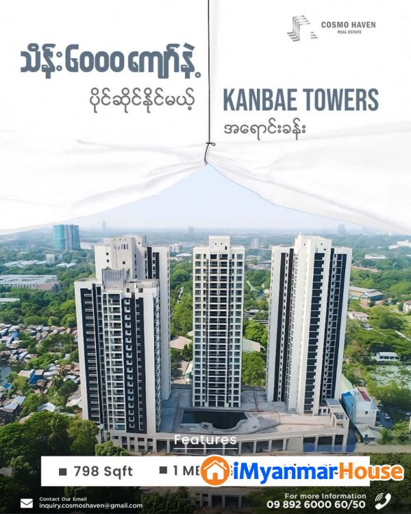 KanBae Tower ကွန်ဒိုအရောင်းအခန်းနဲ့ပတ်သက်ပြီး အသေးစိတ်သိရှိလိုပါက ဒါမှမဟုတ် ကိုယ်တိုင်လာရောက်ကြည့်ရှုချင်တယ်ဆိုရင် COSMOHEAVEN Real Estate ကို အခုပဲဆက်သွယ်လိုက်ပါ......