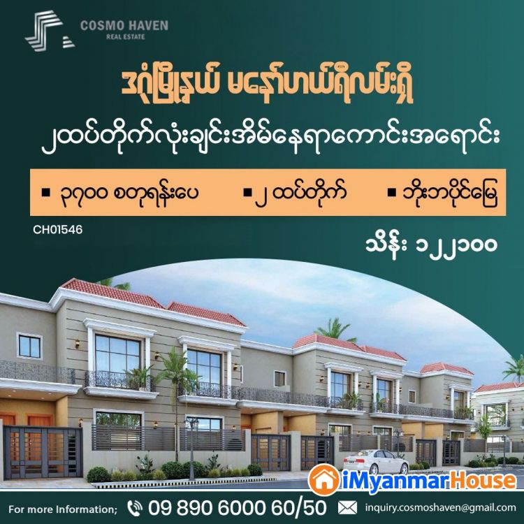 🌳🌳 ရန်ကုန်မြို့ရဲ့အဓိကမိန်းလမ်းမကြီးဖြစ်တဲ့ပြည်လမ်းမကြီးနဲ့အလုံလမ်းမကြီးအနီးမနော်ဟယ်ရီလမ်းတွင်ရှိပြီးရင်းနှီး မြှပ်နှံဖို့သာမက နေထိုင်ဖို့အတွက်ပါသင့်လျော်သောနေရာကောင်းတစ်ခုဖြစ်ပြီးသံရုံးarea တွင်တည်ရှိသောကြောင့်လုံခြုံစိတ်ချရသောပတ်၀န်းကျင်တွင်တည်ဆောက်ထားသောတန်ဖိုးနဲ့စျေးနှုန်းတစ်ထပ်တည်းကျတဲ့၂ထပ်လုံးချင်းအိမ်အ ရောင်းလေးကို စိတ်၀င်စားလို့လိုက်လံကြည့်ရှုလိုပါကကျွန်မတို့ Cosmo Haven Estate ကိုဆက်သွယ်ရွေးချယ်၀ယ်ယူနိုင်ပါပြီရှင်