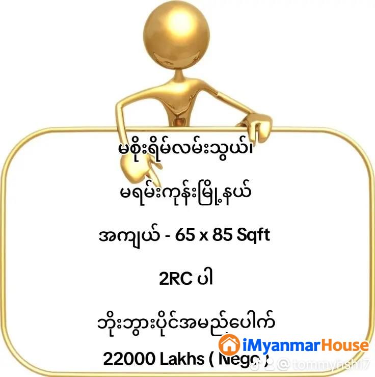 - မရမ်းကုန်းမြို့နယ် မစိုးရိမ်လမ်းသွယ် မြေကွက်ကျယ်- 65 x 85 Sqft- 2RC ပါ - ဘိုးဘွားပိုင်အမည်ပေါက် ဈေးနှုန်း - 22000 ( သိန်း ) ( ညှိနှိုင်းနိုင် )