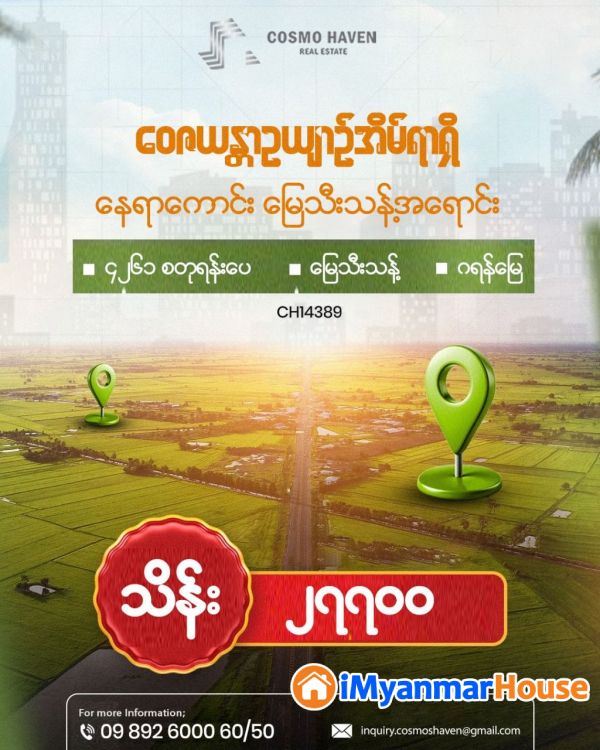 🪄🛣️အဓိကမိန်းလမ်းမကြီးဖြစ်တဲ့ ဝေဇယန္တာလမ်းမကြီးနှင့် လေးထောင့်ကန်လမ်းမကြီးထောင့်တွင် တည်ရှိသောကြောင့် 🏙️ ရန်ကုန်မြို့ရဲ့ အချက်အချာအကျဆုံး နေရာများသို့ သွားရလာရလည်းလွယ်ကူရမယ် အနီးနားပတ်ဝန်းကျင်အရလည်း 🏡🌴စိတ်လုံခြုံမှုအပြည့်အဝပေးနိုင်ပြီး အေးချမ်းဆိတ်ငြိမ်တဲ့အငွေ့အသက်မျိုးကို အပြည့်အဝပေးနိုင်တဲ့ နေရာမျိုးမှာမှ 👩❤️👨နွေးထွေးတဲ့မိသားစုတစ်ခုကို တည်ဆောက်ဖို့စိတ်ကူးထားတဲ့လူကြီးမင်းတို့အတွက်် စိတ်ကူးအိမ်မက်ထဲကအိမ်ပုံစံလေးကို လက်တွေ့အကောင်ထည်ဖော်ပေးနိုင်မယ့်ဝေဇယန္တာဥယျာဥ်အိမ်ရာရှိ နေရာကောင်း မြေသီးသန့်အရောင်းလေးကို ကျွန်တော်တို့ Cosmo Haven Estate မှ ရွေးချယ်ဖော်ပြလိုက်ပါတယ်ခင်ဗျာ✨💁